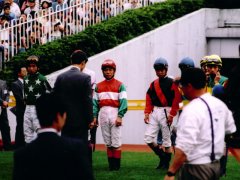レースは順調に進んでメインのダービー。各馬のパドック入場である。ミヤシロブルボンは6番。スペシャルウィークの後。今日は2人引きで若い調教助手さんと厩務員の方か(?)が手綱を持っている。二人共にこやかに笑っているのが非常に印象的だ。厩舎としてもダービーに出走できることが誇らしいのであろう。ミヤシロブルボンは今回から黄色一色のメンコを着けている。評判のスペシャルウィークは初めて見たけど、何だかあまりぱっとしない。それより1頭後ろのミヤシロブルボンの方が良く見える。入ってきた瞬間はこれはいけると内心ガッツポーズが出たほどである。後ろで競馬の追っかけらしき賑やかなグループが、武だ、福永だと言っていたが、ミヤシロブルボンを見て「あれ。俺何だか6番がばかに良く見えるけどどうしたんだろ」と大笑いしている。