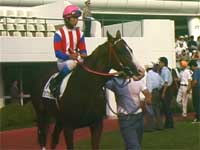 パドックには、前後を牝馬に挟まれるバンダムジシュンが一頭最後尾にまわって、ブレイクショットは最後から2頭目に現れた。今日の中山は残暑が厳しく、程度の差はあるものの各馬ともに汗をかきまくり。ブレイクショットも御多聞にもれず、かなりの発汗である。適度にうるさいのはいつも通り。厩務員さんを少々てこずらせ気味。今日は両前肢と、右後肢の飛節にプロテクターを着けている。どこかで聞いたのだが、ブレイクショットは好調になると走っている時に蹄をぶつけて怪我をしてしまうとか。これは好調のしるしなのだろうか。バンデージの方が奇麗なのに...とは私の独り言。「BREAKSHOT」の小さな(^^;横断幕も出ているし、ここは頑張り所だよブレイクショット。